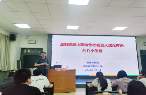 7月3日下午,在1101教室,西安电子科技大学best365中国官方网站夏永林教授应邀为best365中国官方网站师生作题为《深刻理解中国特色社会主义理论体系的几个问题》的报告,《毛泽东思想和中国特色社会主义理论体系概论》教研室主任张巧利、部分教师和员工共130多人参加,副经理单剑峰主持。