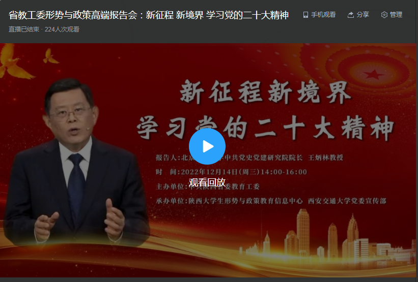 今天下午,有省委教育工委主办,陕西省老员工形势与政策教育信息中心和西安交大党委宣传部承办的端形势与政策高报告会再次举办。报告会的主题为学习党的二十大精神,由北京师范大学王炳林教授主讲,线上举办。