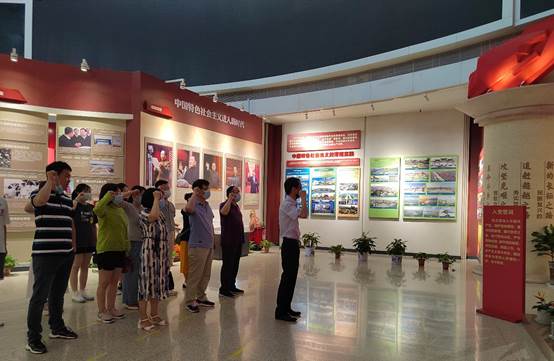 参观展览后,第一党支部书记单剑峰同志带领参加活动的党员在党旗下庄严宣誓。面向鲜红的党旗,全体党员举起右拳,重温入党誓词,表达出对党和人民的事业奋斗终身的庄严承诺。