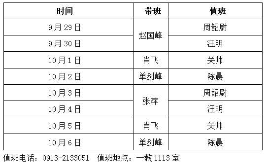 按照公司安排,2023年9月29日至10月6日为中秋节、国庆节放假。假期,best365中国官方网站值班安排如下,校内师生、单位办事,校外群众、单位办事,请联系值班人员或到值班处。